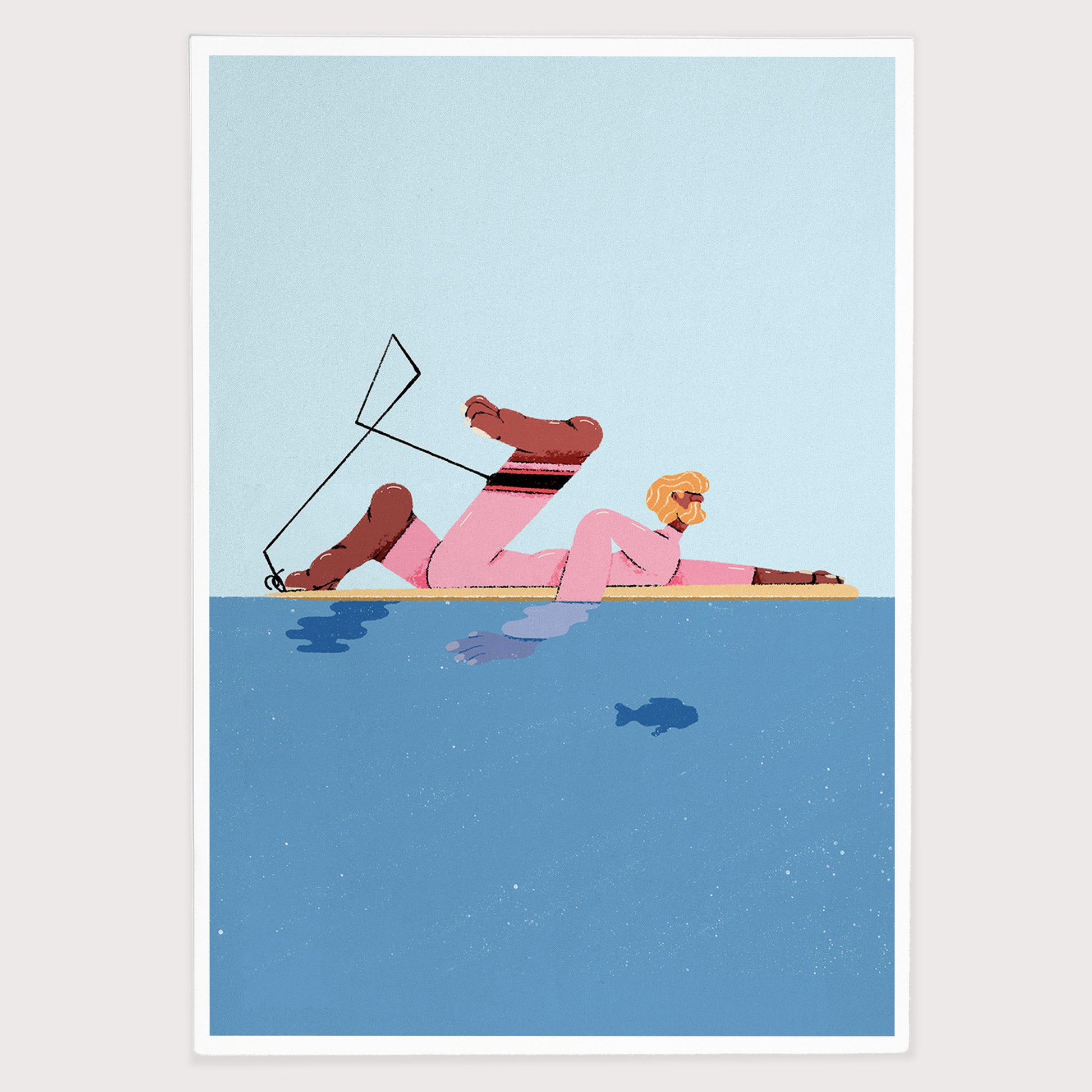 This illustration captures the essence of calm and leisure – a relaxed moment on the water, blending soft colors, clean lines, and a touch of surrealism. The harmonious composition and unique aesthetic make this piece the perfect highlight for any sophisticated home.